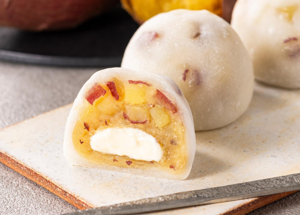 「浓厚奶油地瓜大福(浓厚バターお芋大福)」是一款秋季限定的大福,由口感柔滑的地瓜泥、湿润的地瓜切丁以及入口即化的咸香国产新鲜奶油制成。地瓜泥是由口感蓬松如同烤地瓜的「鸣门金时地瓜」和口感滑顺多汁的「GOLDEN SWEET 地瓜」制成,而带有像蒸地瓜一般口感的「红遥地瓜」则经过糖浆慢炖后再加入地瓜泥中,以带来更多丰富的口感。中心的奶油馅与冲绳海盐一起打发,入口即化,余韵清爽。整体甜而不腻,让人回味无穷。
