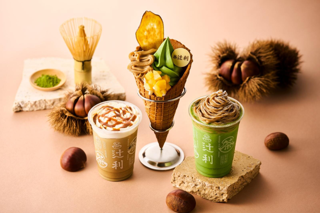 辻利的秋季限定甜点推出了一款圣代及二款饮品,其中「辻利霜淇淋秋季圣代(辻利ソフト秋のパルフェ)」在饼干甜筒里挤满了宇治抹茶霜淇淋,再淋上糖煮栗子奶油,并撒上金黄酥脆的糖渍栗子,再点缀上大片的地瓜片,呈现出秋收的华丽景象,浓郁的抹茶香气与栗子的醇厚口感完美融合,让人回味无穷。