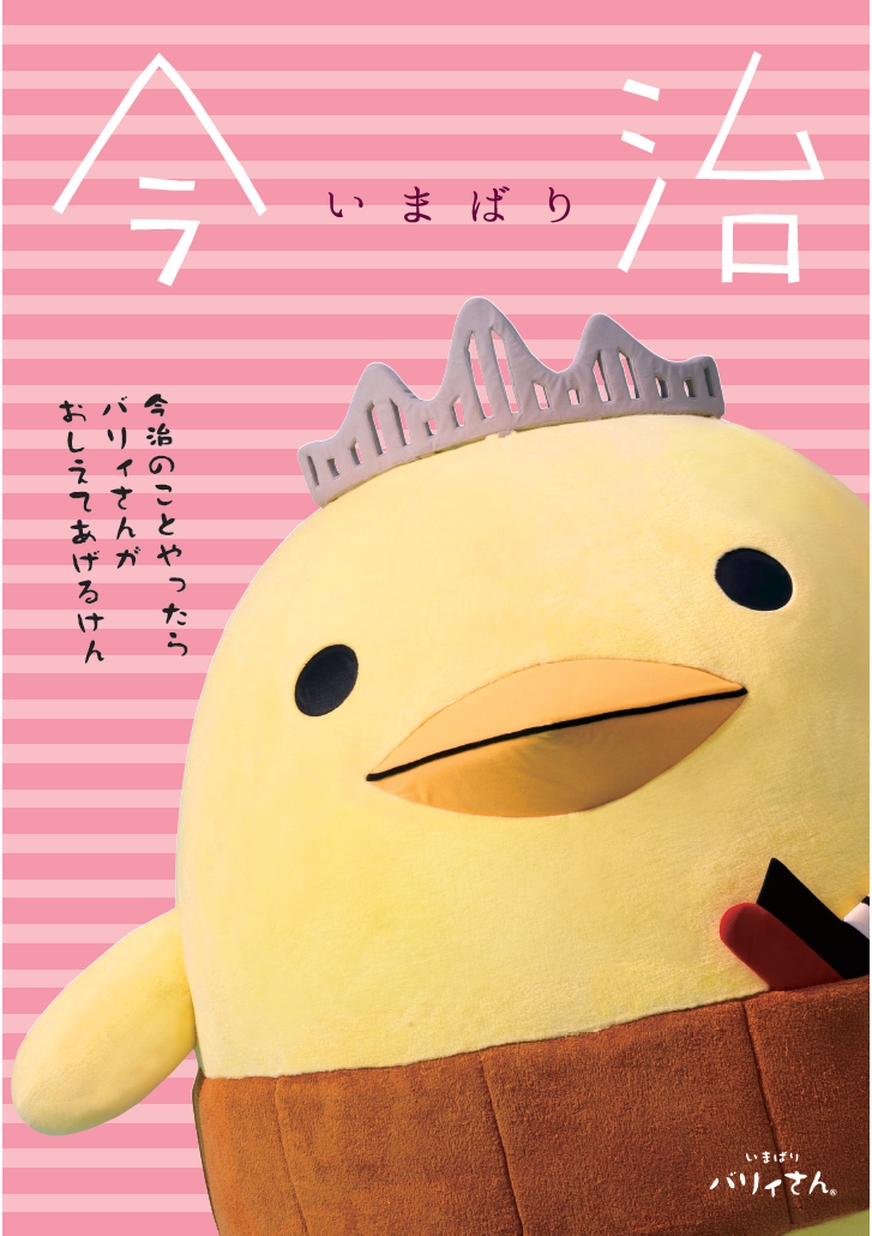 这只头上戴着类似皇冠的头饰,肚子上围着腹卷的黄色小鸟,是爱媛县今治市的吉祥物「BARYSAN」,头上戴的状似皇冠的头饰其实是「来岛海峡大桥」,而肚子上围的腹卷还是今治毛巾材质,喜欢的食物甚至是爱媛县今治市最有名的烤鸡肉串,从形象到喜好处处都能见到爱媛县今治市相关特色代表。