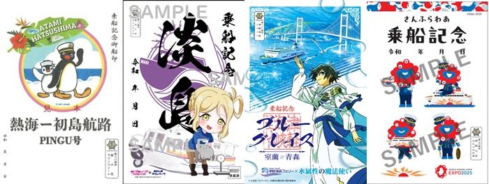 此外,有些船公司也会与动漫及知名IP角色合作推出限定版的御船印。例如热海的「富士急マリンリゾート」在2022年与企鹅家族联名,今年6月也有淡岛的「あわしまマリンパーク」与动画《LoveLive!Sunshine!! 》中的角色小原鞠莉的合作。8月开始,「商船三井さんふらわあ」推出2025年大阪万博吉祥物脉脉的版本,而「津軽海峡フェリー」则推出动画《水属性的魔法师》的合作款,各式各样的联名款,无不勾起粉丝们的收藏欲望。