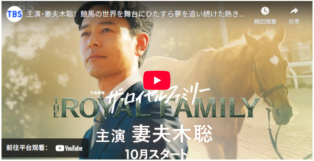 由妻夫木聪主演的《The Royal Family》是改编自同名小说,以赛马比赛为舞台的故事,讲述持续追逐梦想的赛马师与赛马,以及伙伴、家人一次次创造奇迹,跨越20年的感人故事。