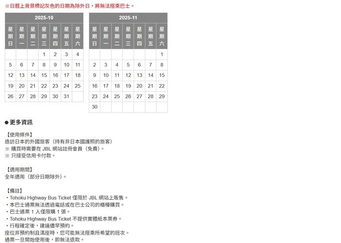 「日本东北巴士套票」还有详细的使用规格,例如只有持「非日本护照的外国旅客」可以购买与使用,只接受网路购买与信用卡付款等等。