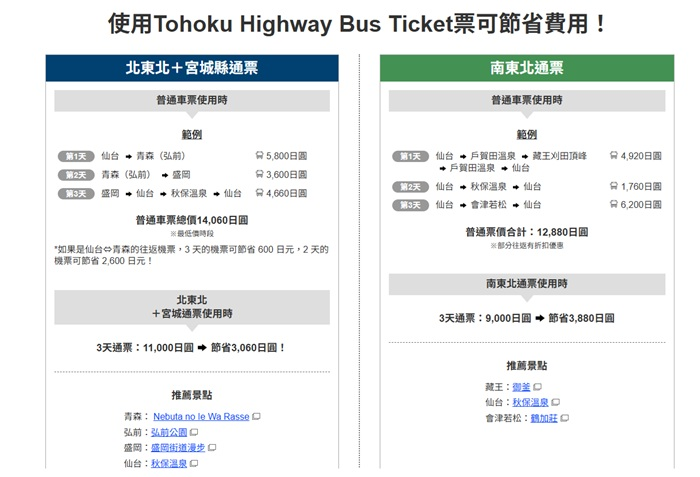 如果你是不想搭乘新干线烦恼行李放置,或是想要有更多路线弹性的话,就可以购买这张「日本东北巴士套票」,官方网站甚至还帮你举出范例,算出某几条路线比较优惠,如果不抗拒长途巴士的话,也是不错的选择!