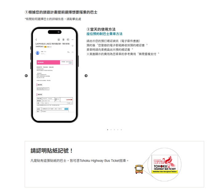 因为「日本东北巴士套票」只限限于官网购买,所以是没有纸本票券的,一律都是使用电子票券,只要在上车前认清出巴士是否有上图右下角的图示,并出示上图的手机票券画面,即可搭车。