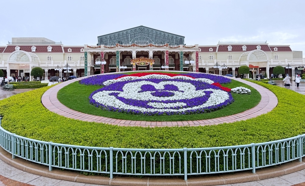 进入园区后,便可以看到大型花坛上以花卉描绘出戴着圣诞帽的米奇图案。