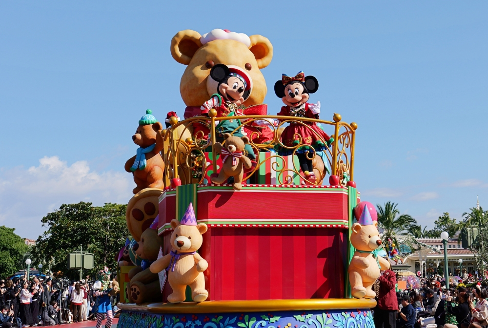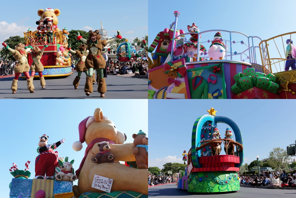 游行车上可以看到各种挂满圣诞节装饰的泰迪熊,从圣诞老人玩具工厂诞生的玩具们,跟着米奇、米妮、唐老鸭、黛丝、奇奇、蒂蒂、高飞、布鲁托等迪士尼好友一同出现在游行车上。
