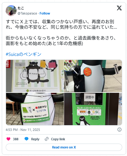 此外也有网友表示看到X上有许多粉丝担心再也无法入手企鹅的周边,他本人也感慨以后街道上或许再也见不到Suica企鹅的身影。 X上也有其他网友纷纷晒出自己曾拍过的Suica企鹅身姿以及入手的周边商品等等。