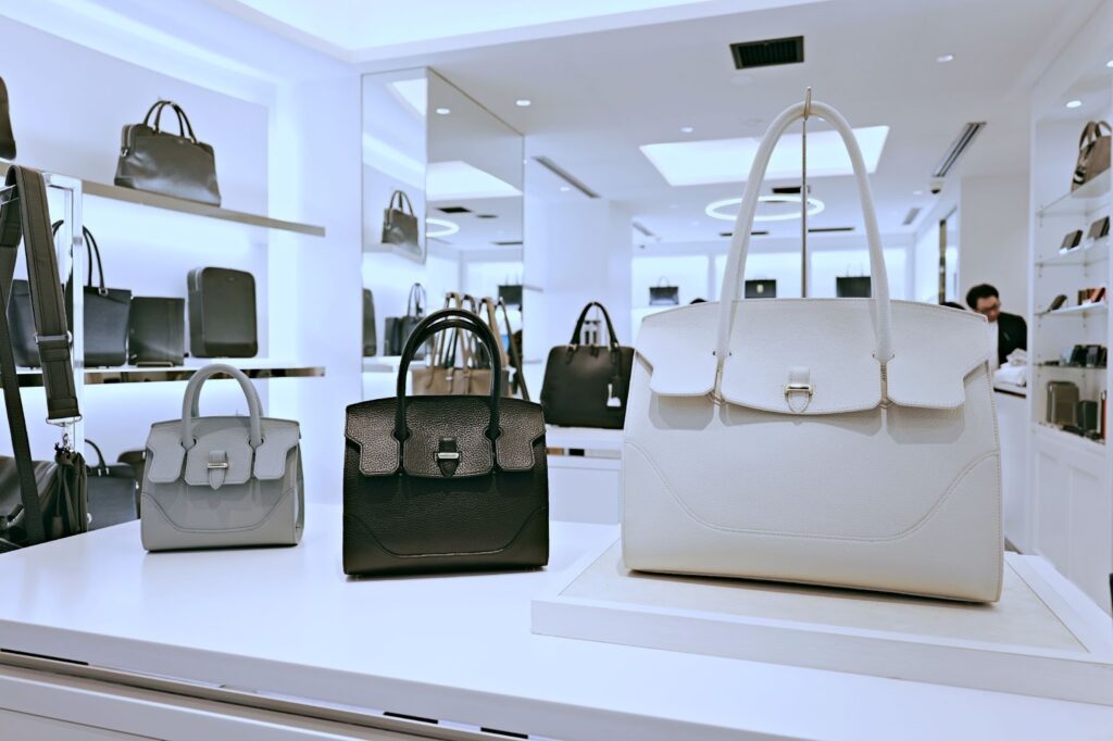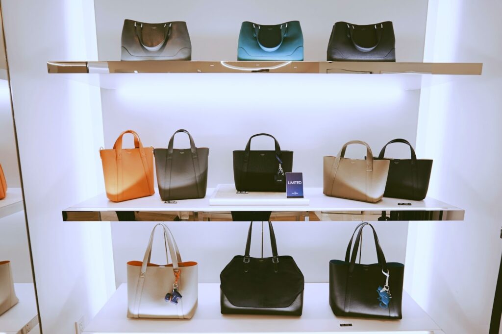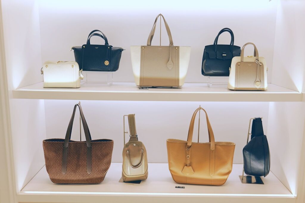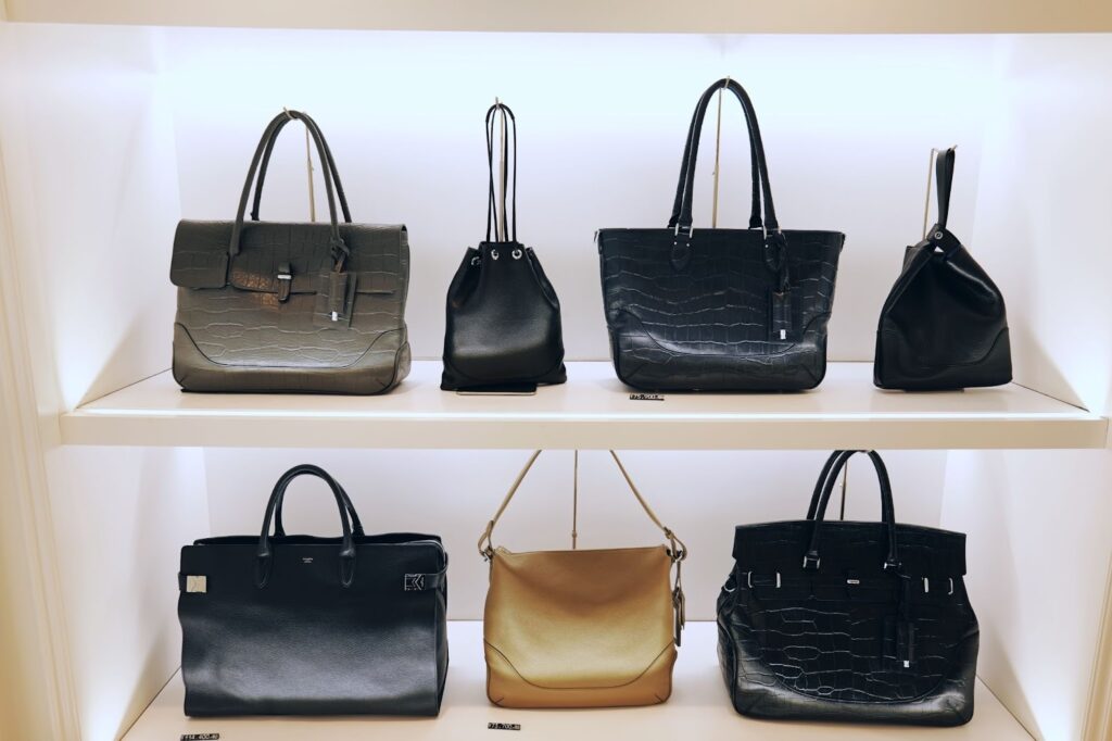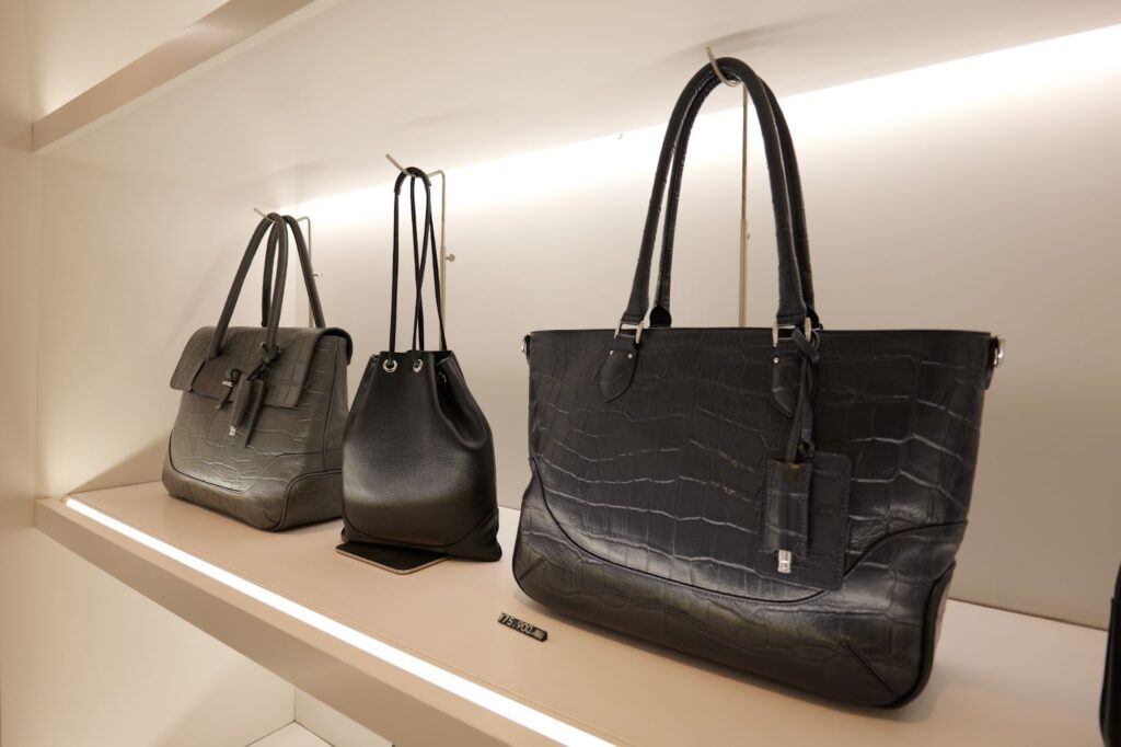 这里的包袋陈列方式与快时尚品牌完全不同,不是那种密密麻麻堆满货架的感觉,而是像艺术品一样被精心摆放。从适合通勤的大容量托特包,到精致优雅的晚宴手拿包,再到充满设计感的男士公文包和波士顿包,款式非常齐全。灯光打得恰到好处,能清楚看到每一寸皮革的纹理和每一个五金件的光泽。