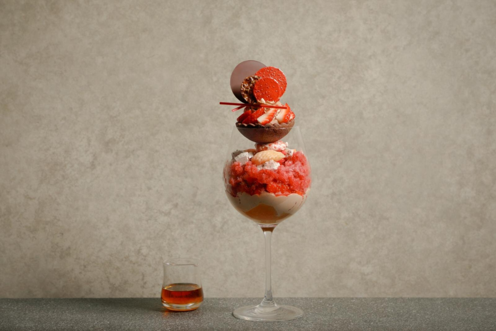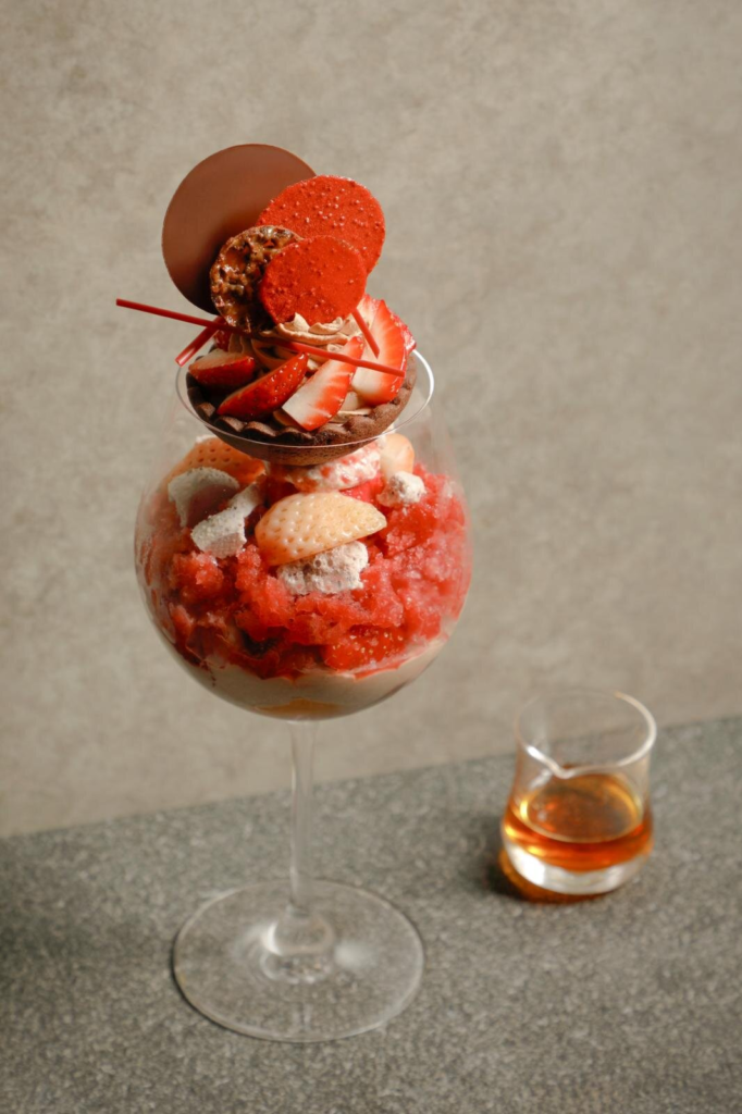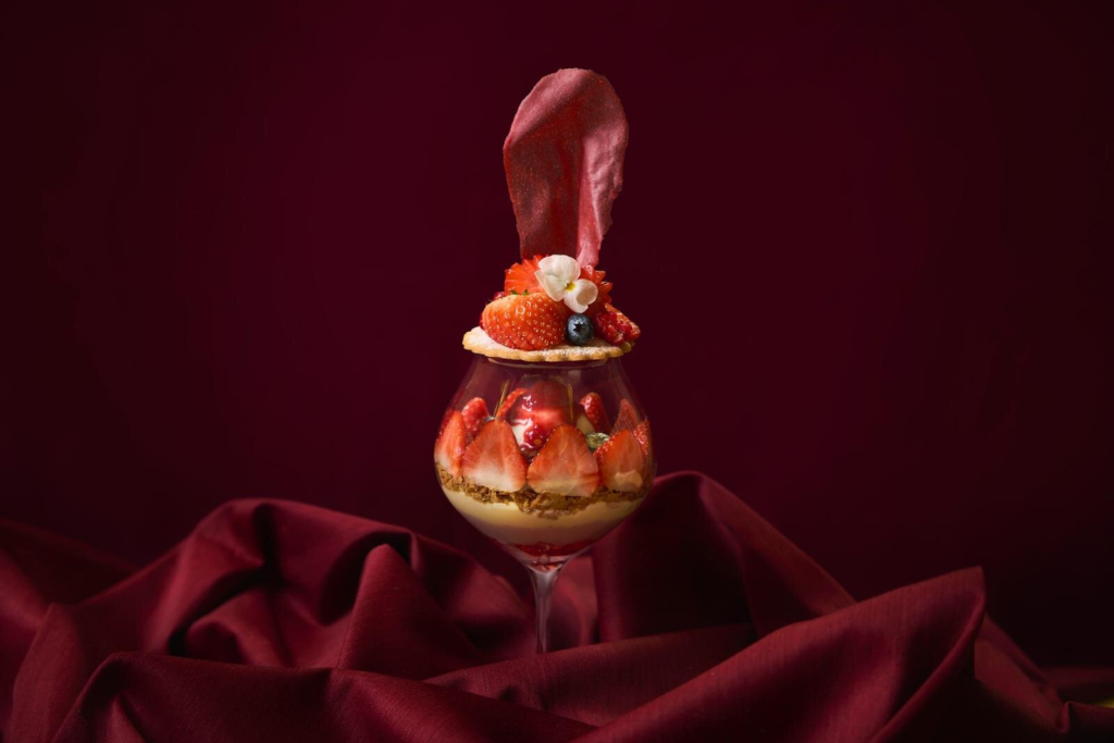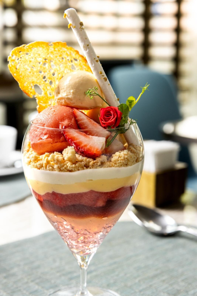 Giorgio Armani 位于表参道的咖啡店几乎每个月都会推出一款新的期间限定圣代,迎接新年度的第一个月将端出满满草莓的「草莓玫瑰圣代(莓ローズのパフェ)」。杯中分层铺放着带来口感的咸香碎粒、轻盈的鲜奶油、优格和香草奶油。品尝时,酸甜的腌渍草莓、浓郁的石榴香醋酱、清爽的佛手柑果冻和玫瑰果冻交织成深红至粉红的渐变色泽。顶部点缀着略带咸味的烤面包片、精致的玫瑰蛋白霜、香草冰淇淋和草莓玫瑰冰沙。这是一款专为成人打造的奢华圣代,口尝过后余韵悠长,令人回味无穷。