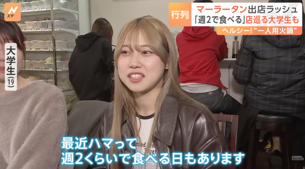 有日本媒体称麻辣烫是「一人火锅」,不像传统的锅物料理,即使突然找不到朋友,想吃热热汤食的时候也能自行前往。但也有日本大学生相揪,与朋友们一起「吃遍麻辣店」。在麻辣烫刚盛行时,每天仅有约50人排队,没想到爆红后增长至160多人,展现极高人气。