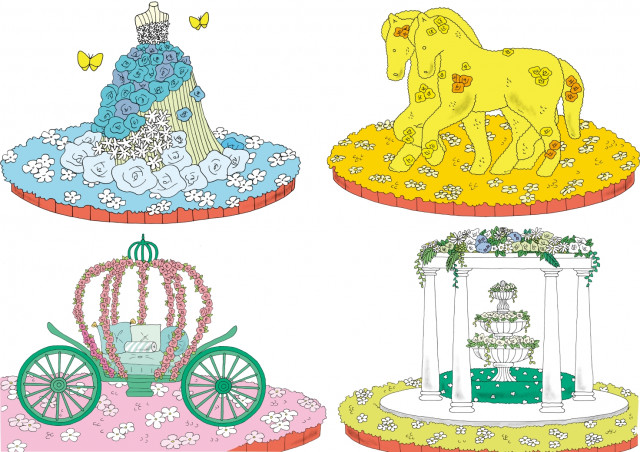 在红、蓝、黄、绿、粉红、紫、橘等共9 种主题色系的花海中,花朵依颜色分区盛开;各主题色区域内,将展示以花卉打造的花卉小马、花卉礼服等「艺术作品」。每件艺术作品周边皆设有迷你椅等布置,可放置偶像周边拍照,作为专属的「偶像应援拍照点」。