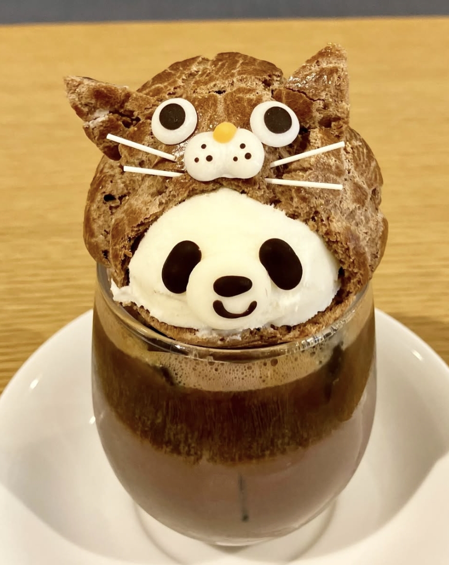 就连饮品也有期间限定的熊猫造型,像是这杯装扮成猫咪的熊猫摩卡咖啡「ねこかぶりパンダのカフェモカ」,摩卡咖啡上头盛着一球熊猫造型的冰淇淋,而熊猫冰淇淋上面又以猫咪造型的可可泡芙皮做点缀,不仅造型性十足,还能一次品尝到可可泡芙、香草冰淇淋以及摩卡咖啡搭配在一起的滋味。