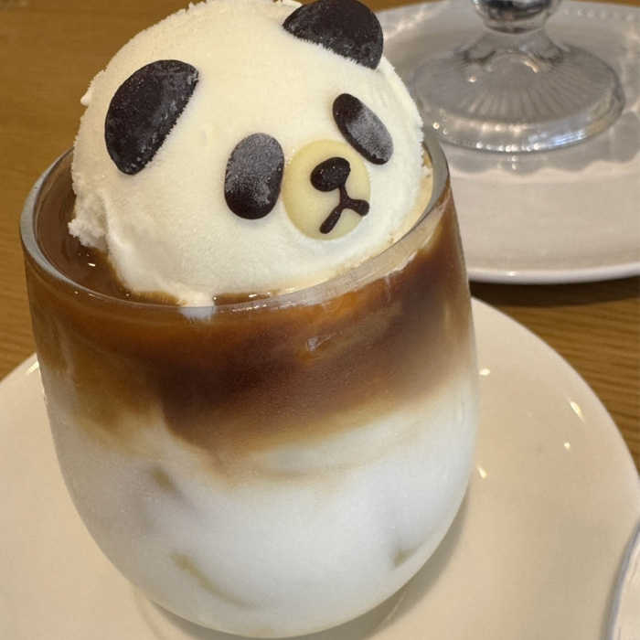 虽说甜点都是主打期间限定、每日限量,但还是有可爱的造型饮品是常态贩售,比如说这款冰咖啡,上面添加了一球熊猫造型的香草冰淇淋,让咖啡变得更加特别。