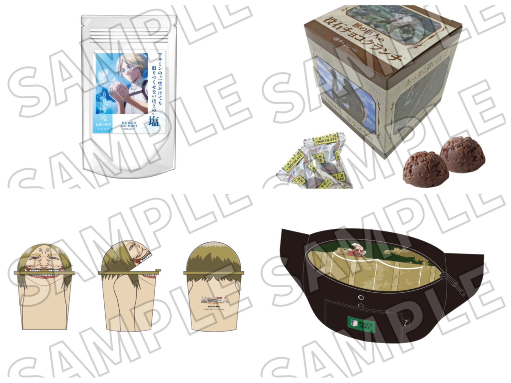 除了必备的立牌、吊饰之外,还有结合当地特色及命名或设计令人会心一笑的周边,例如淡路岛产的「阿尔敏取之不尽的盐」、「兽之巨人投石巧克力」、「黛娜巨人垃圾桶」等,共有将近40种!