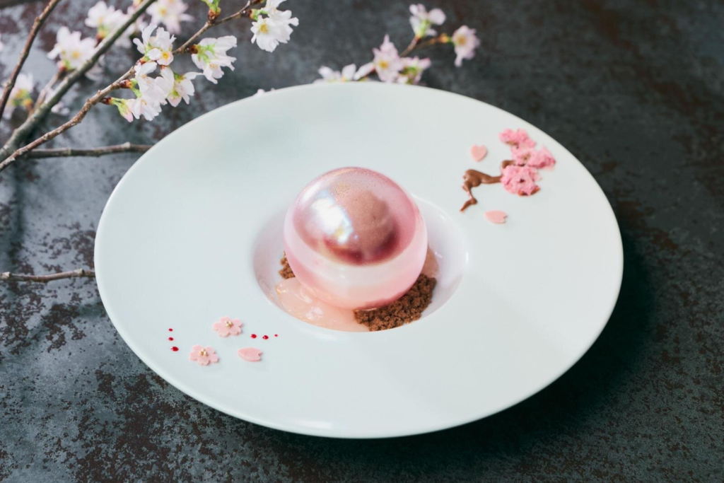 位于京都的「THE THOUSAND KYOTO」2 楼的 TEA AND BAR 将从3 月1 日起至4 月30 日为止,期间限定春季限定甜点。其中,令人眼睛为之一亮的就是这款充满樱花气息的甜点「Perle Rose Sakura(ペルル・ロゼ・サクラ)」。在透明的樱花色球形外壳中,内馅是樱花豆沙冰淇淋、覆盆子和马斯卡彭慕斯。享用这款有趣的甜点,只需轻轻敲开球体,即可品尝到软糯的樱花酥底和蓬松酥脆的达克瓦兹蛋糕。盘底撒上的樱花巧克力和荔枝果冻,更添春日气息。