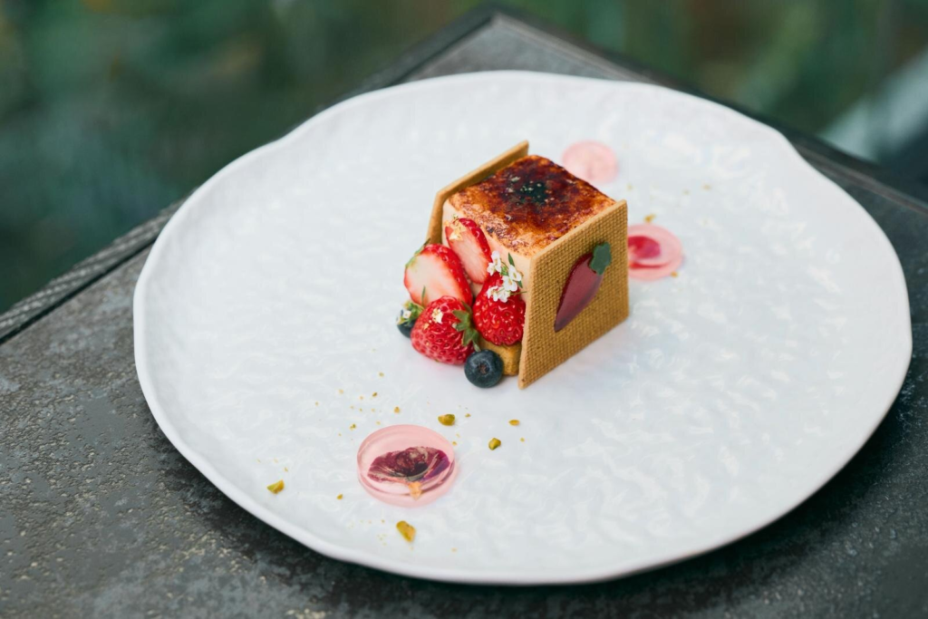 酥脆焦糖塔「Chibouste Ruire(シブースト・リュイール)」摆盘上宛如从珠宝盒中倾泻而出的草莓和鲜花。整体是由柔滑的起司布丁、草莓酱和香气四溢的开心果酥皮组成,不仅外观精美,味道也令人惊艳。