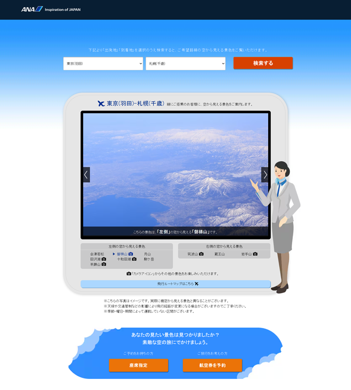 此外ANA还有提供各个航线可以看到的景色查询,以羽田飞札幌为例,输入起飞与降落地点后,官网就会自动跳出沿途中会出现的景色,并且贴心标明在左侧还是右侧,如果已经买票的话就可以按「座席指定」来选位,真的非常贴心!
