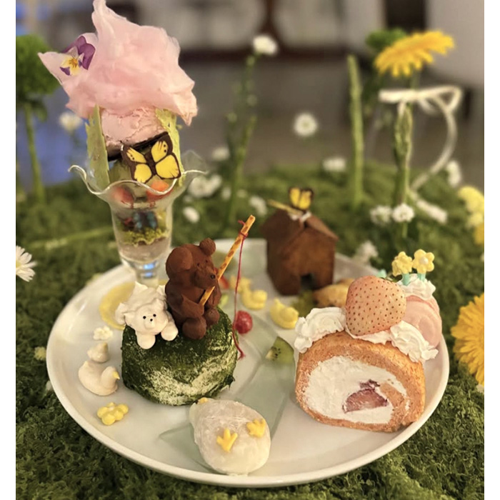 这道初春庭园下午茶,整个摆盘上所用到的点缀与装饰都是甜点中的一环,有充满春天感的圣代、粉嫩的草莓蛋糕卷,特意打造成犹如长满绿苔的小丘的抹茶提拉米苏,上面还有以生巧克力制成的泰迪熊在钓着鱼,旁边则是蛋白霜做成的狗狗;河川则是以水蓝色的果冻打造而成,河川内还有以蛋白霜做成的小黄鸭、用大福做成的大胖鸭等,整体十分热闹生动。