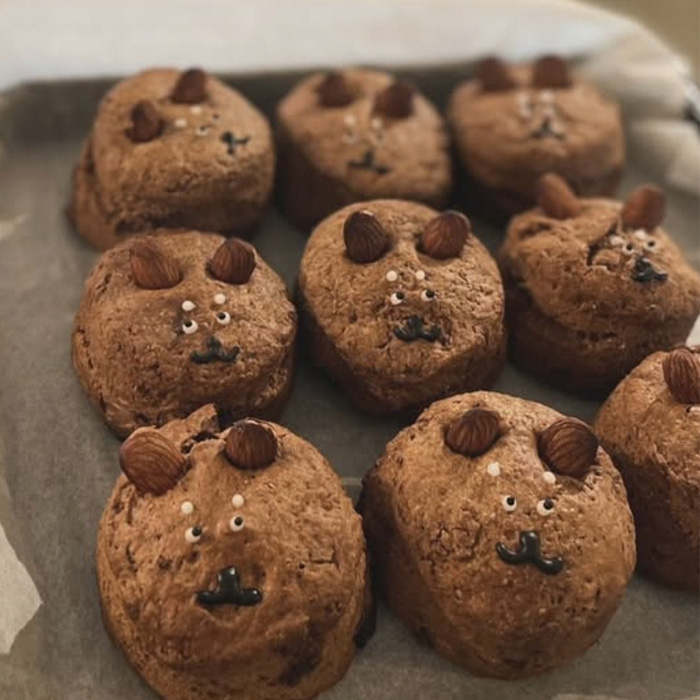 还有口味为巧克力的狗狗司康(Wチョコ犬),有着一眼就能看出是巧克力口味的深咖啡色,耳朵以坚果点缀而成。
