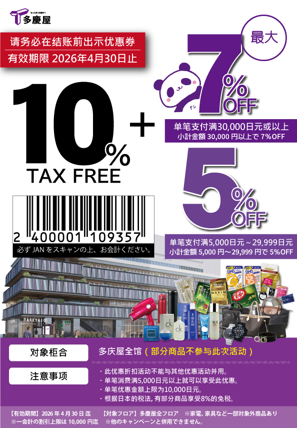 ・单笔支付满30,000日元或以上享10%免税+7%折扣